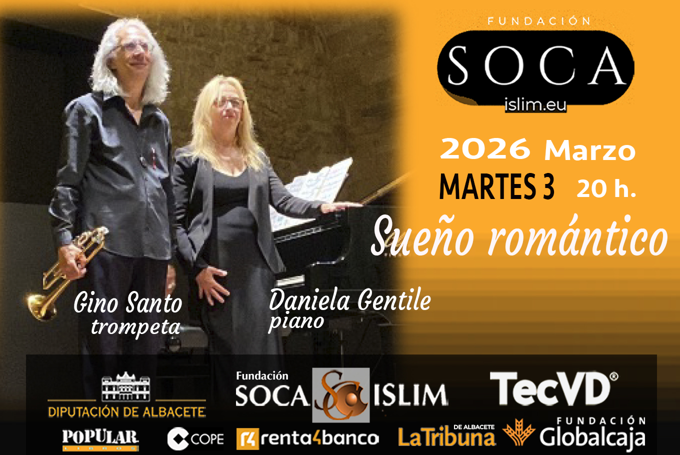 - Martes, 3 – 20h. . Centro «Alicia de Larrocha» de Interpretación y Hermenéutica Musical. Casino Primitivo de Albacete. FIMCA26 (XXVI Festival internacional de música de cámara de Albacete). PITROS duo: Luigi Santo (trompeta) y Daniela Gentile (piano). «Sueño romántico» es un recorrido musical a través de la peculiar sonoridad del dúo trompeta y piano, desde Haendel a Gershwin, pasando por Rachmaninov, Turrin y Piazzolla, en versiones propias de los intérpretes.