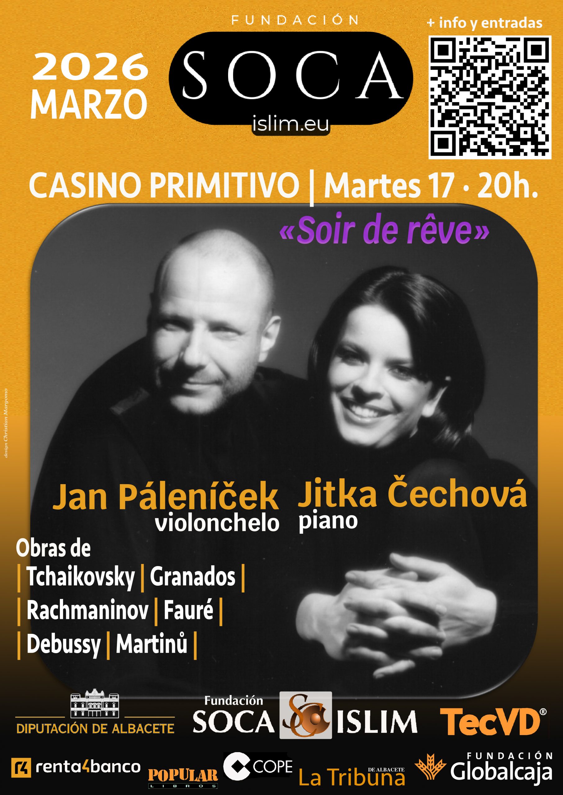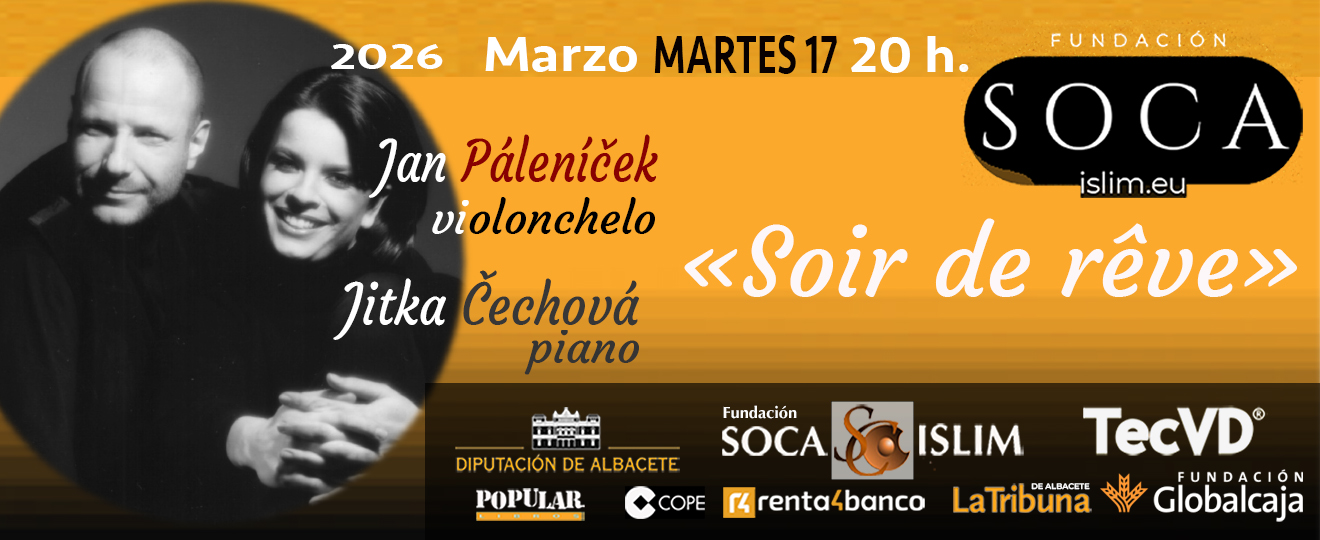 - Martes, 17 – 20h. . Centro «Alicia de Larrocha» de Interpretación y Hermenéutica Musical. Casino Primitivo de Albacete. FIMCA26 (XXVI Festival internacional de música de cámara de Albacete). Por enfermedad ineludible sobrevevenida a la violinista, se confirma el programa conforme sigue: «Soir de rêve» con los miembros del SMETANA trio Jan Páleníček (violonchelo) y Jitka Čechová (piano), con obras de Tchaikovsky (Vals sentimental, op. 51 nº 6), Rachmaninov (Sonata op. 19), Granados (Danza española), Debussy (Beau soir), Fauré (Aprés un reve), Ravel (Habanera) y Bohuslav Martinů (Variaciones sobre un Tema Eslovaco, H. 378), en lugar del previsto SMETANA trio con Jitka Čechová (piano), Markéta Janoušková (violín) y Jan Páleníček (violonchelo). «Joyas del trío clásico». Obras de Haydn (Trio en Sol M. “Al’Ongarese”), Martinu (Trio ien re m. nº2) y Mendelssohn (Trio nº 2 en do m., op 66).
