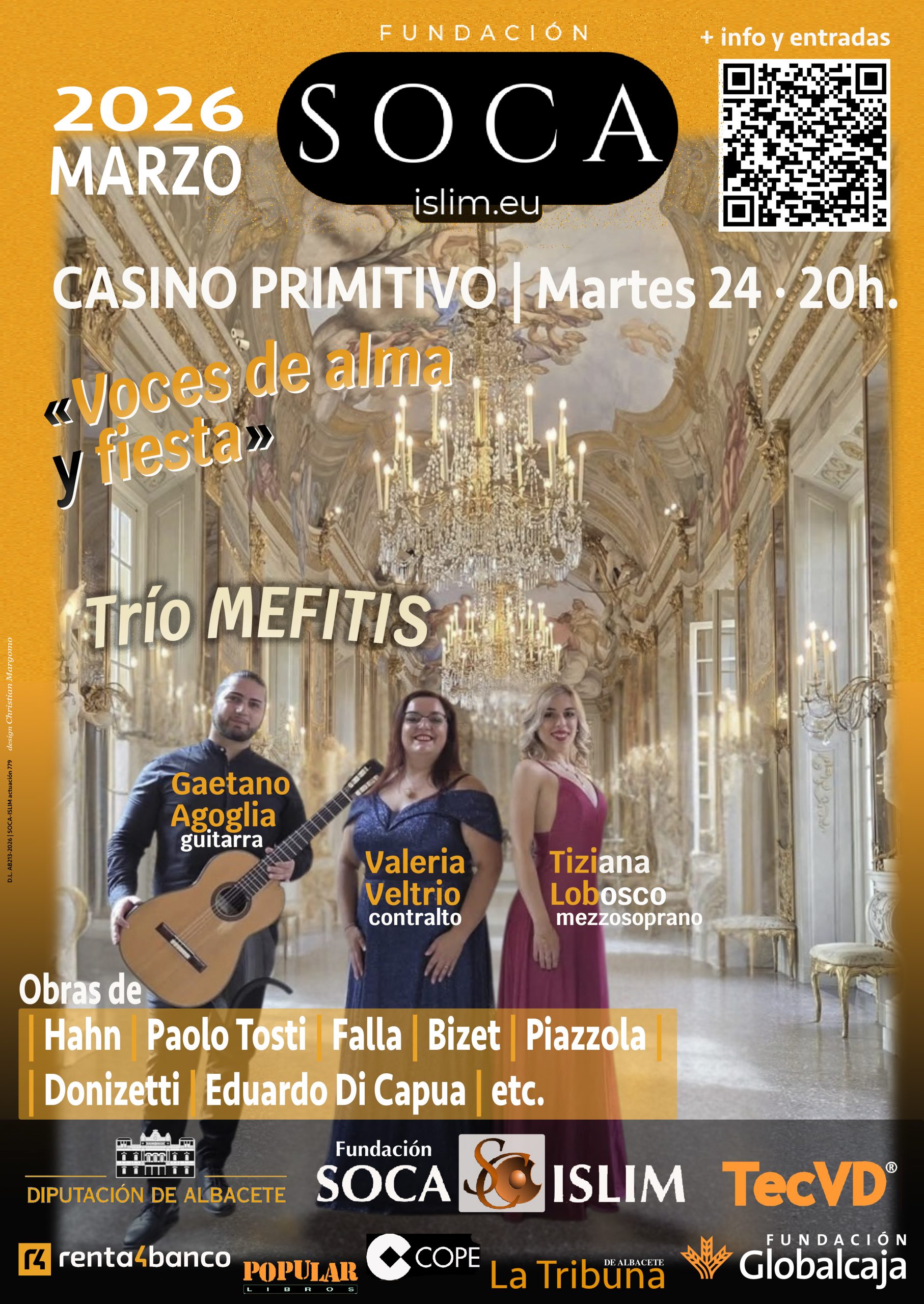 - Martes, 24 – 20h. . Centro «Alicia de Larrocha» de Interpretación y Hermenéutica Musical. Casino Primitivo de Albacete. Jornada lírica: «Voces de alma y fiesta». Trío Mefitis, con Valeria Veltrio (contralto), Tiziana Lobosco (mezzosoprano) y Gaetano Agoglia (guitarra). El Trío Mefitis fue fundado por músicos de alta formación académica, procedentes de diferentes orígenes musicales. Los miembros del trío tienen una larga carrera como solistas y han colaborado con algunas de las principales instituciones musicales europeas e internacionales. Obras de Hahn, Paolo Tosti, Falla, Bizet, Donizetti, Eduardo Di Capua, etc.