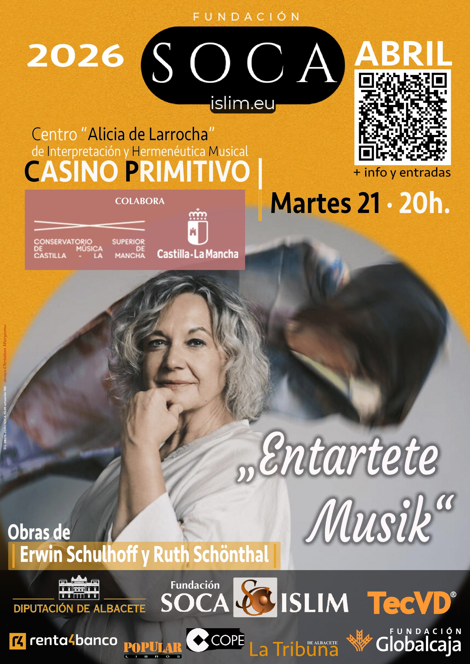 - Martes, 21 – 20h. . Centro «Alicia de Larrocha» de Interpretación y Hermenéutica Musical. Casino Primitivo de Albacete.FIPA26 (XXVI Festival internacional de piano de Albacete). „Entartete Musik“. La pianista Sophia Hase, presentada en Salzburgo en su juventud por Herbert von Karajan, debuta en el Festival Internacional de Piano de Albacete con un interesante programa dedicado a la música proscrita por el III Reich, con obras de Erwin ( Schulhoff (Praga, 1894 – campo de concentración de Wülzburg, 1942) y Ruth Schönthal (Hamburgo, 1924 – Nueva York, 2006), en colaboración con el Conservatorio Superior de Castilla La Mancha.