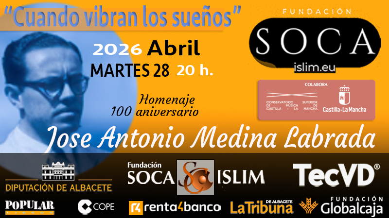 - Martes, 28 – 20h. . Centro «Alicia de Larrocha» de Interpretación y Hermenéutica Musical. Casino Primitivo de Albacete.FIPA26 (XXVI Festival internacional de piano de Albacete). “Cuando vibran los sueños”. El dúo de piano a cuatro manos formado por Mercedes Medina y Elena Cadierno, celebran el 100 aniversario del nacimiento del pianista, compositor y poeta José Antonio Medina Labrada, padre de la pianista Mercedes Medina, con obras del propio compositor intercaladas con versos de su poemario Horas sin meta en la voz de Adolfo Díaz.