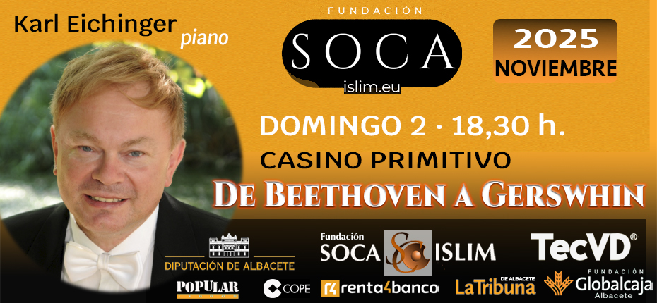 - Domingo, 2 – 18,30h. Centro «Alicia de Larrocha» de Interpretación y Hermenéutica Musical. Casino Primitivo de Albacete. Karl Eichinger (piano). «De Beethoven a Gerswhin. Entre la Patética y el Summertime.» El pianista austriaco considerado como “la última encarnación del intérprete de Gerswhin” por la revista American Fanfare, debuta en el Festival Internacional de Piano de Albacete (FIPA25) con un programa que abarca desde la Patética de Beethoven a la versión pianística del turco Facil Say de Summertime de Gerswhin, pasando por los preludios del americano y obras de Freidrich Gulda, estreno en Albacete.